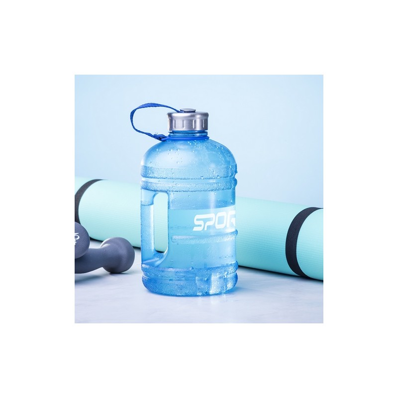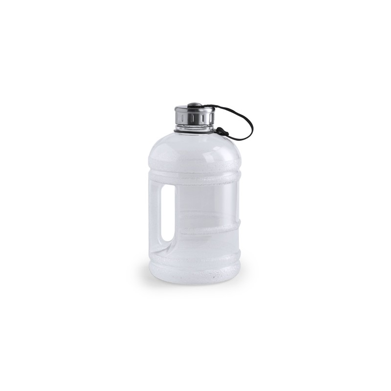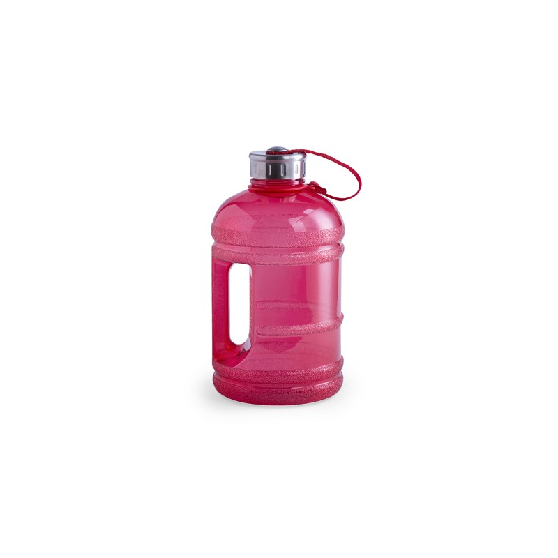 High capacity -1.89L-, PET bottle, with transparent body and in a wide range of vivid transparent colors. Screw-on safety lid in stainless steel material, with anti-loss strap in matching color and practical carrying handle.