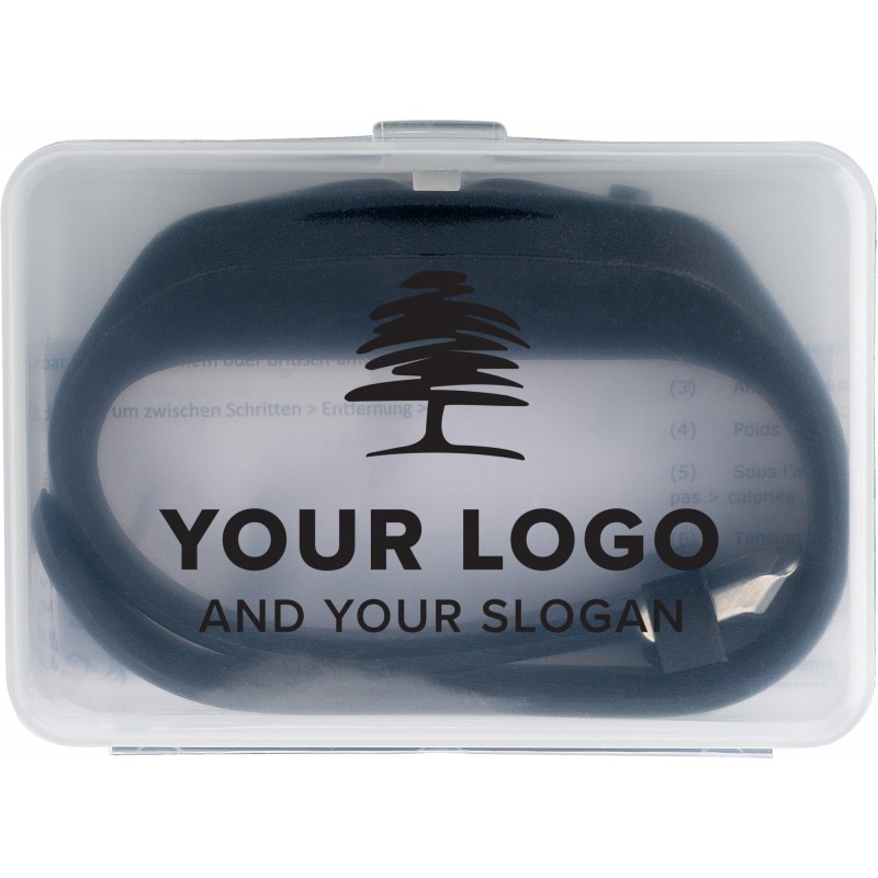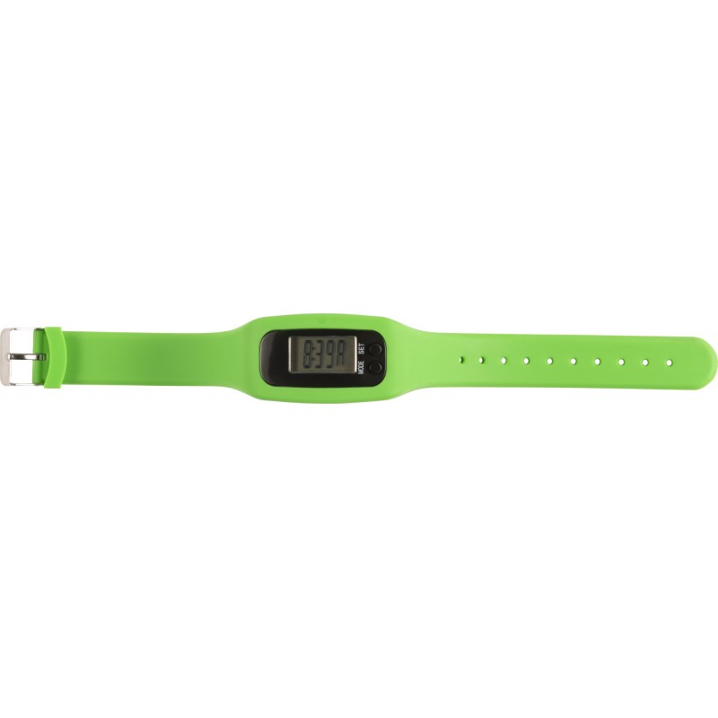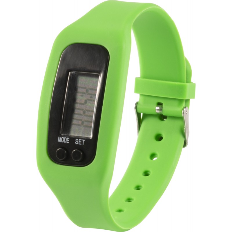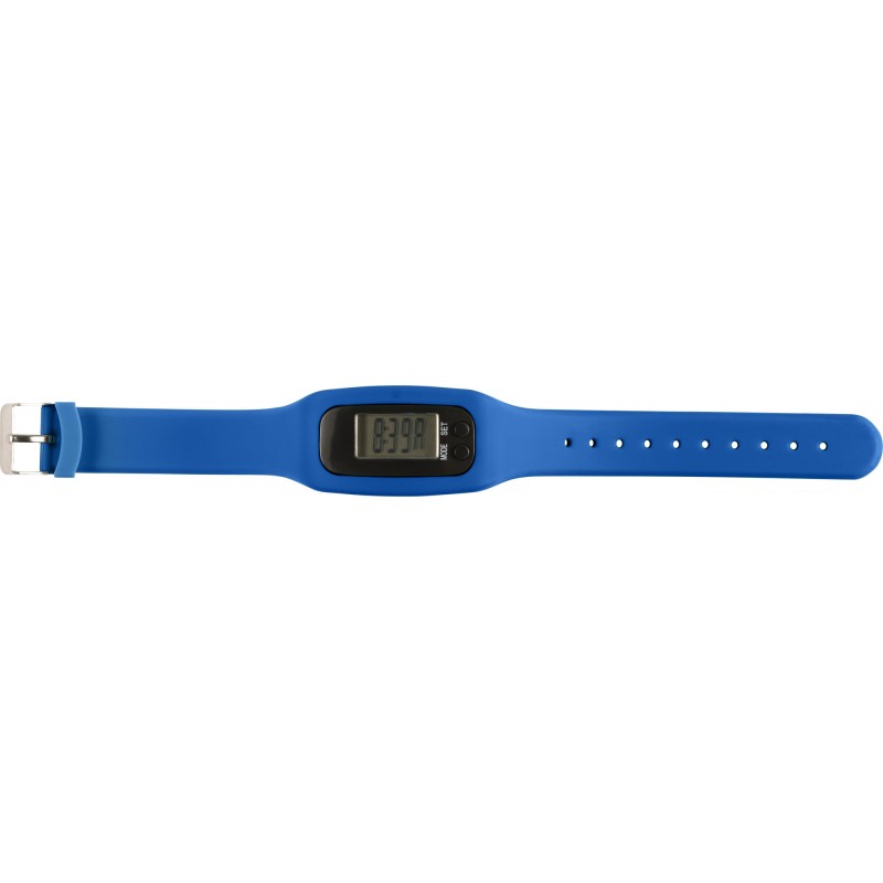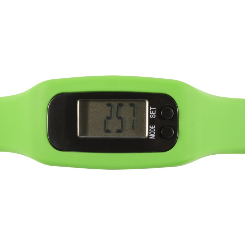 Pedometer with silicone wristband. Records steps (up to 99.999), calories, and distance (miles/km). Batteries included. DC:1.5V