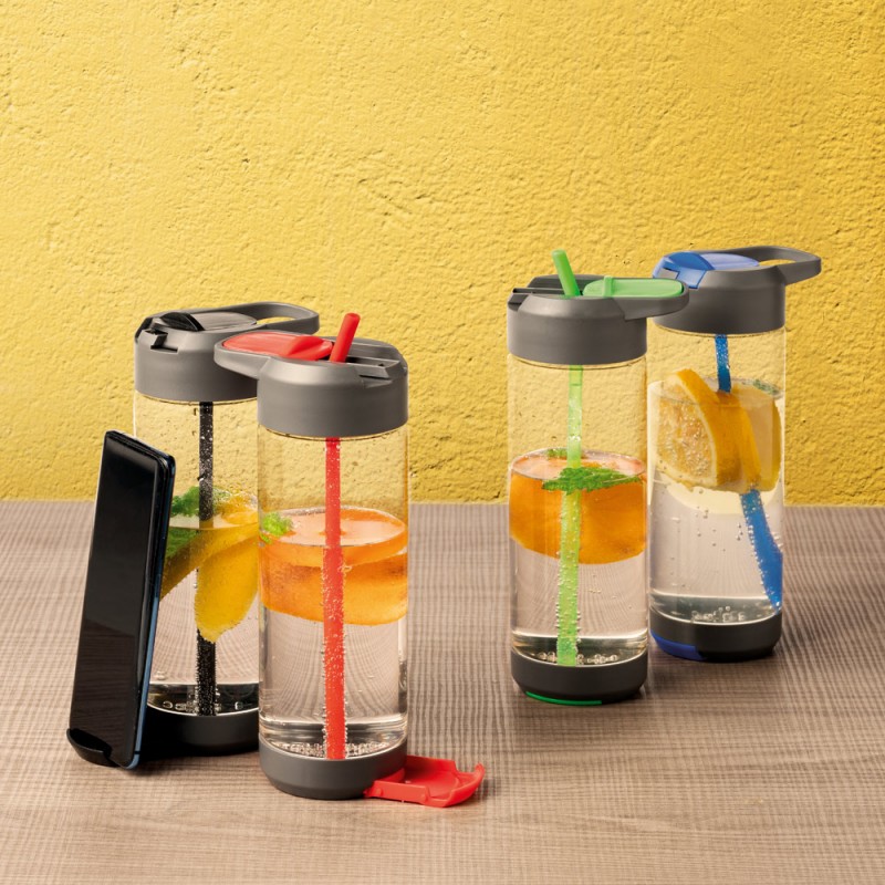 Sports bottle in Tritan™ with flexible straw (inside). Easy opening and closing system. Contains smartphone holder and has a capacity of up to 750 ml. ø75 x 222 mm