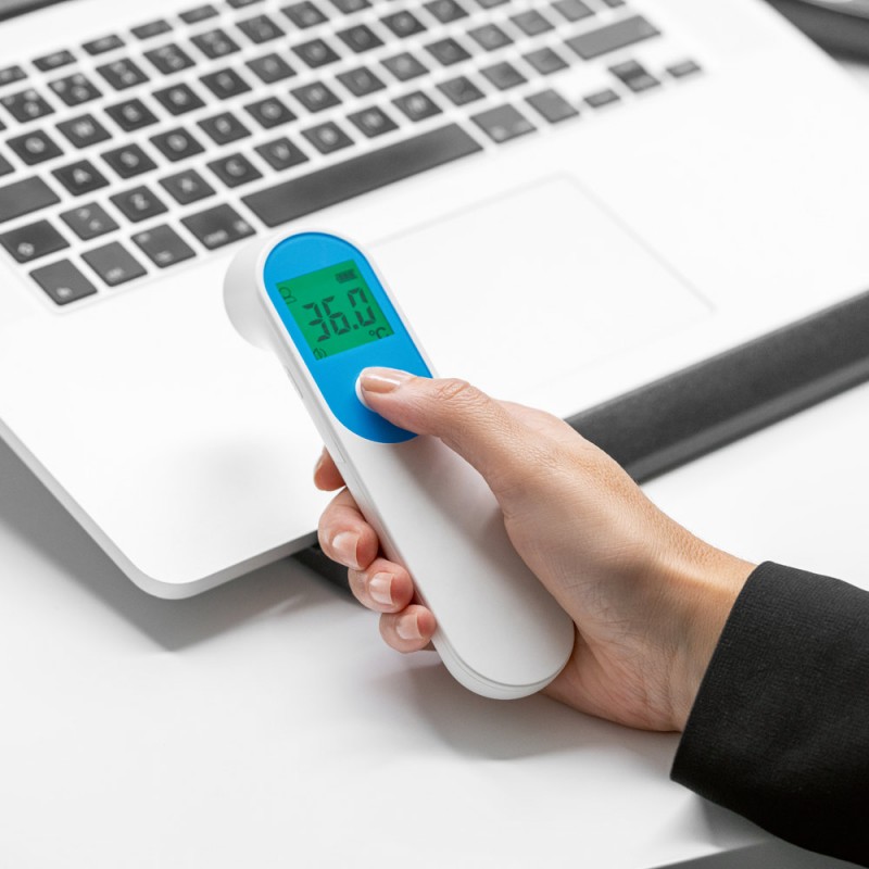 Non-contact digital infrared thermometer. ABS thermometer with 2 AAA batteries included. Includes high precision sensor that allows to measure the temperature in just 3 seconds. Product classified as Class IIa medical device according to Directive 93/42/EEC. Allows the measurement of body temperature and temperature on surfaces. Device with memory of the last 20 measurements. Backlit LCD display, with acoustic indication when temperature measuring is complete. Temperature units: Celsius scale (°C) and Fahrenheit scale (°F). Body temperature measurement range: 32.0°C-43.0°C (89.6°F-109.4°F). Surface temperature measuring range: 5.0°C-95.0°C (41.0°F-203.0°F). Supplied in a box. 38 x 160 x 38 m.