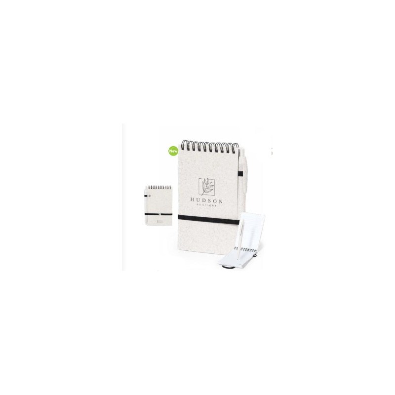 Set of ring notebook with wheat straw covers and matching ball pen, also in wheat straw. Compact size, with elastic closure in elegant black. Including 70 sheets with single-striped layout and eco design. Push-button mechanism ball pen in blue ink, with Wheat Straw logo. Presented in an individual recycled bag.