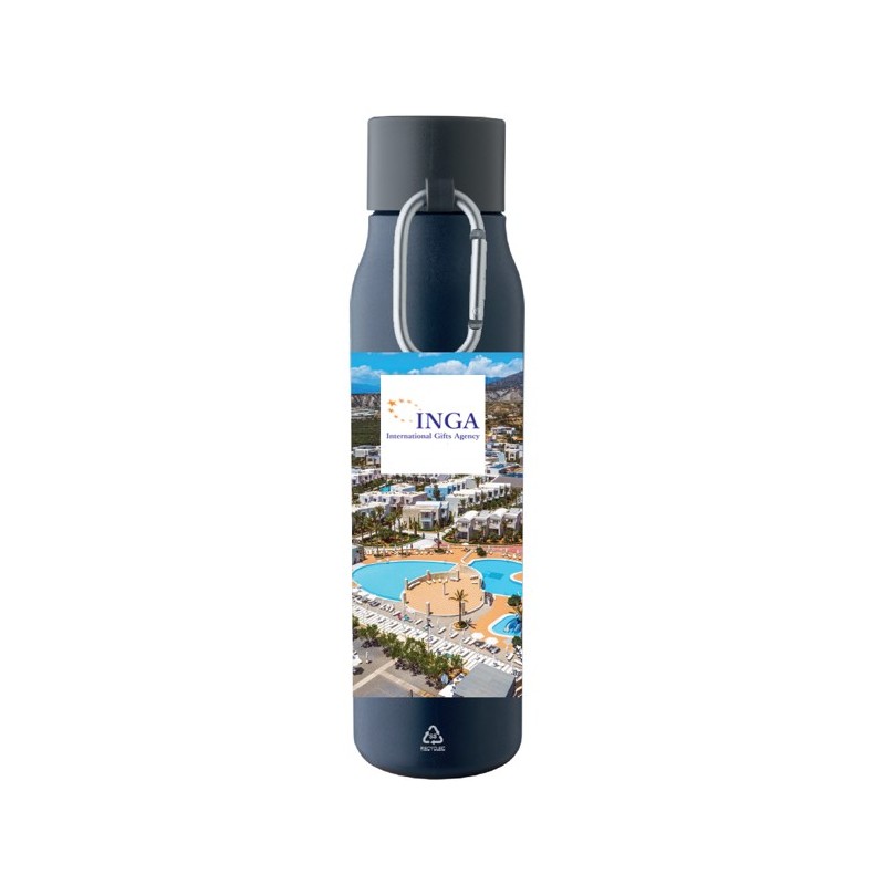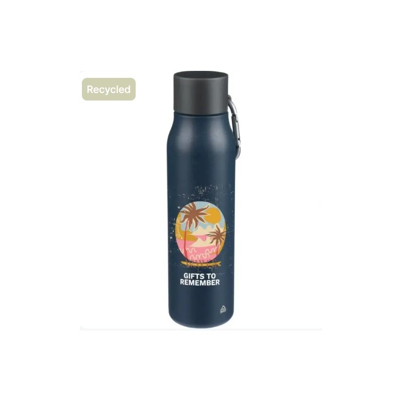 Recycled stainless steel drinking bottle (600 ml). The interior is made of stainless steel 304, and the exterior is stainless steel 201. Features a leak-proof black PP lid with an aluminum carabiner hook and carrying loop. Carabiner hook is not suitable for climbing. Keeps beverages hot for 6 hours or cold for 9 hours. Includes an engraved recycled logo on the front. Individually packaged in a brown cardboard box.