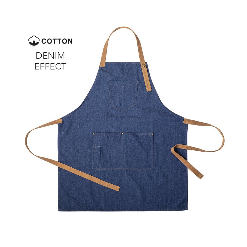 High-quality apron in heavy-duty fabric with denim finish. Fitting under the knee, with button adjustable neck strap and reinforced, brown color waist straps. Multiple pockets for convenient storage and access to utensils. Reinforced stitching and metal rivets.