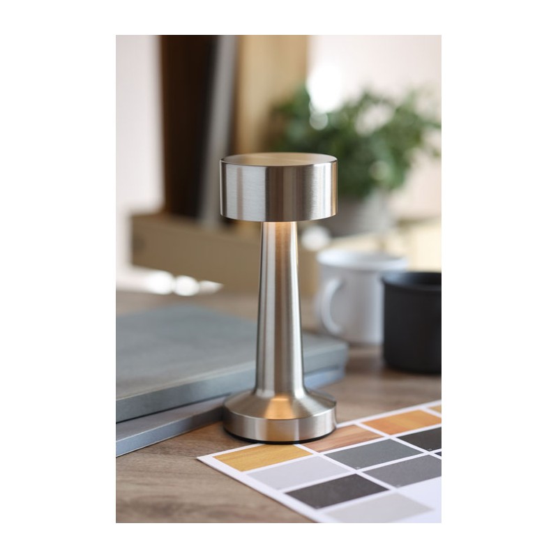 Stainless steel bar table lamp with 24 LEDs, adjustable brightness and 800 mAh USB rechargeable battery. With warm, natural and cool light modes. Including USB charger cable.