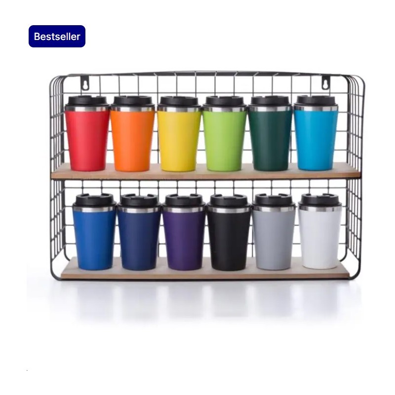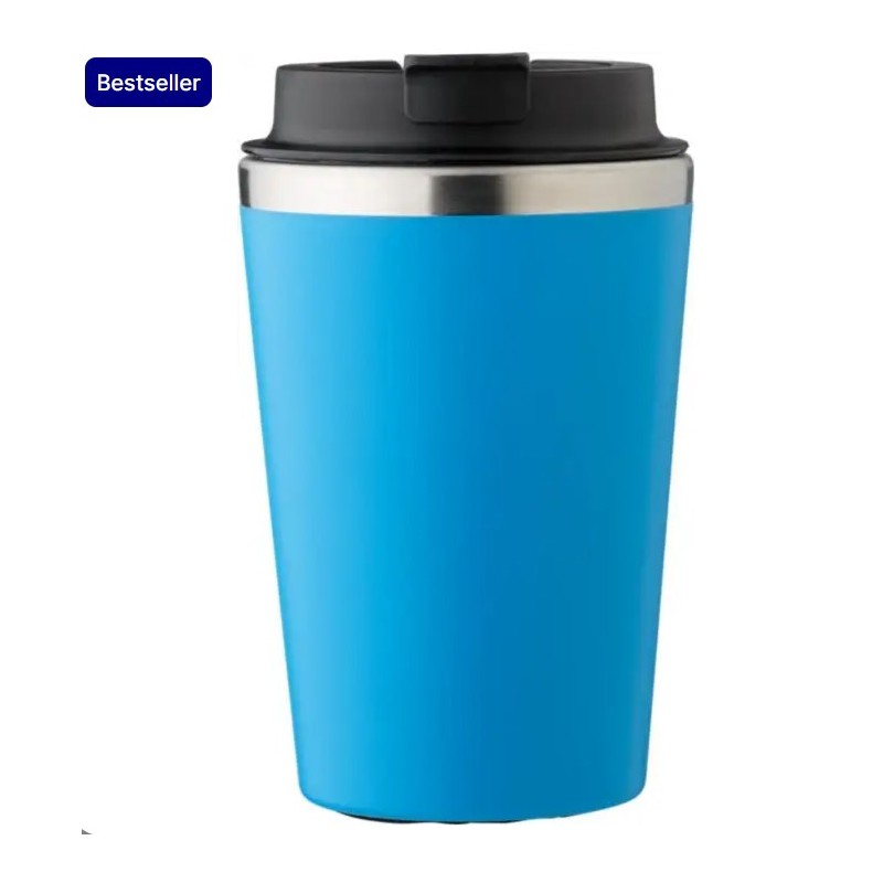 Stainless steel and PP travel mug (350 ml). The PP lid has a silicone closing ring with a foldable closure on top. Individually packaged in a brown cardboard box.