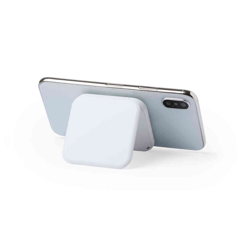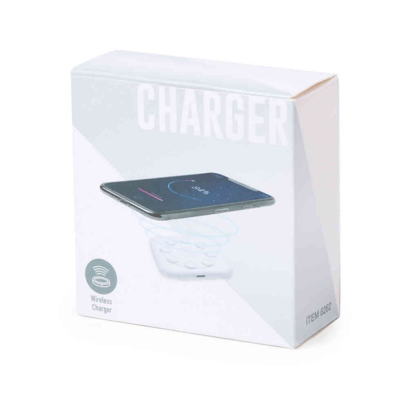 Wireless, ultra innovative design charger with suction pads and smartphone holder function. In monochrome, white color design and including micro USB charging cable. Compatible with devices equipped with wireless charging technology. Presented in an elegant white box.