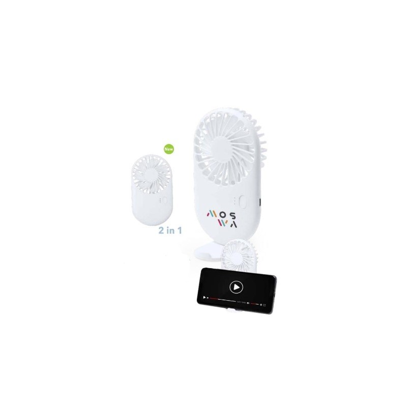 Portable fan made of durable ABS. With three speeds and integrated smartphone holder. Powered by a 300 mAh battery, with charge level indicator lights and Micro USB cable included. Presented individually in a kraft design box.