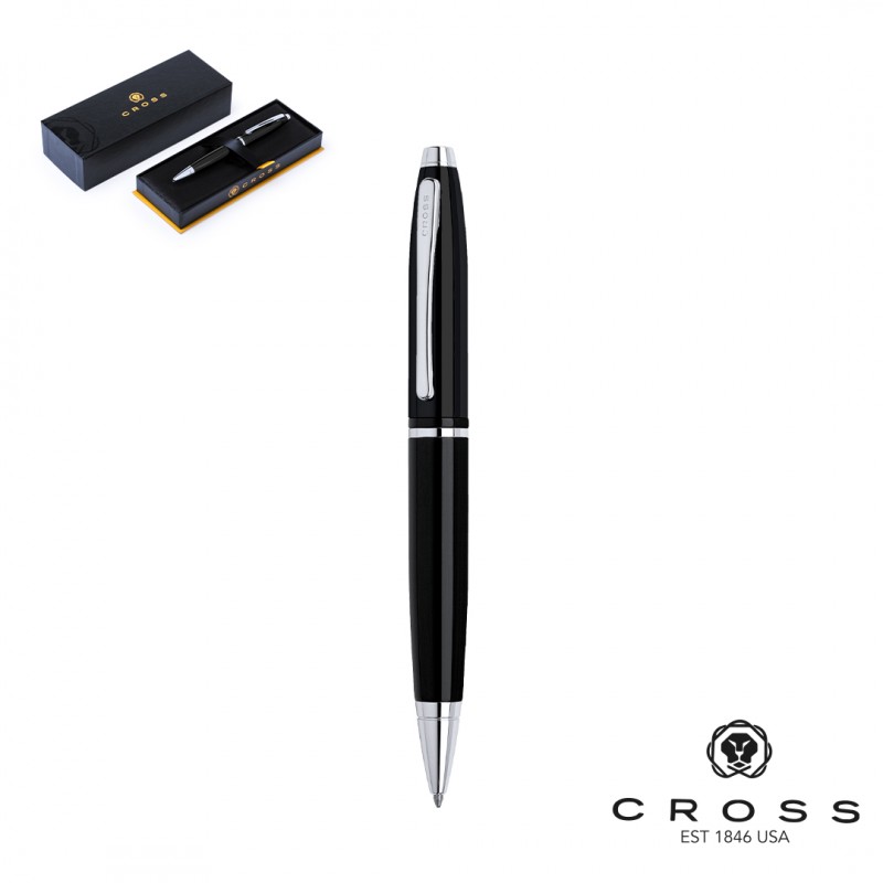 Ball pen Calais by Cross. With retractable mechanism, elegant bicolor design and metal body in smooth finish in varied colors. Presented in an elegant individual case in black, with the brand logo and inside in soft velvet. Black ink.