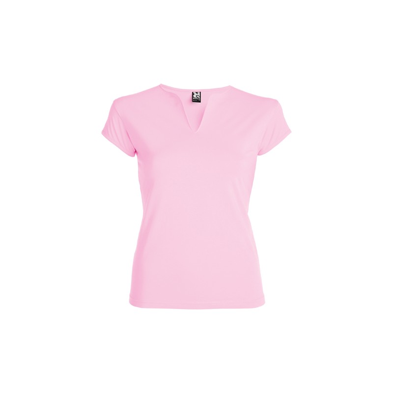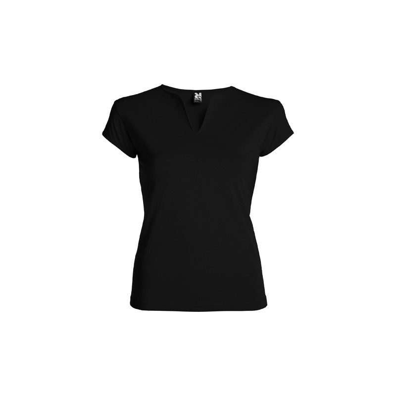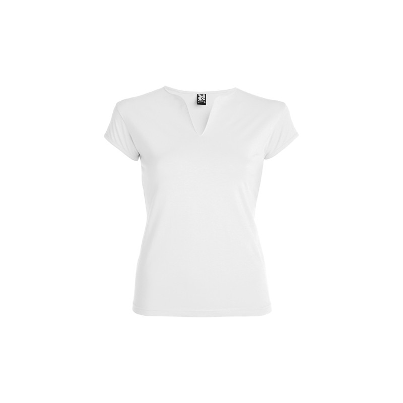 Round collar fitted t-shirt with V opening on front. Trimmed half-sleeve and side seams.