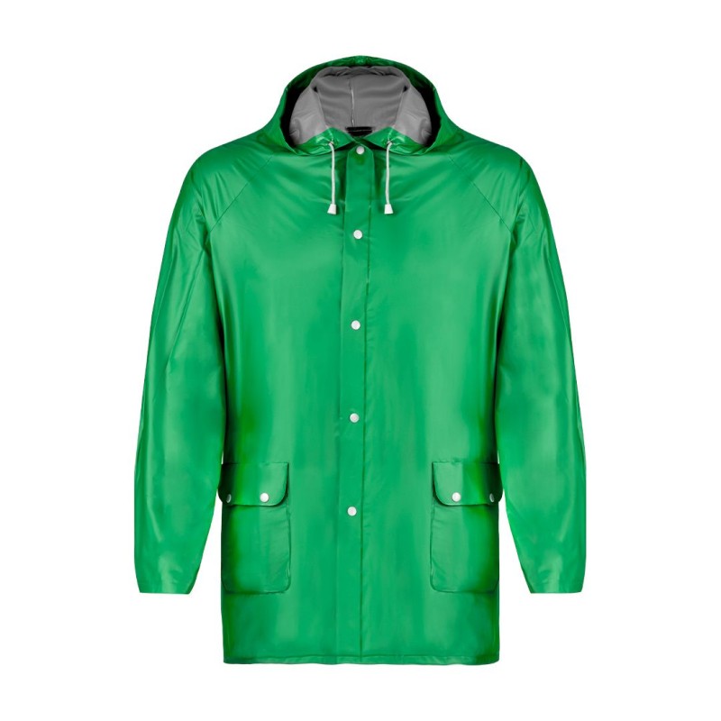 Raincoat in resistant PVC with heat-sealed finishing in a wide range of tones. With hood and strings, button closures and pockets. Available in sizes M-L, XL-XXL.