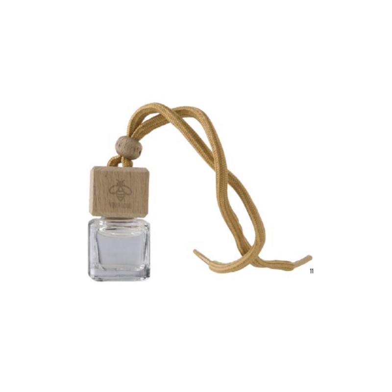 Glass refillable car freshener with beechwood lid, and polyester rope. Oil smells like ''new car'' and has no alcohol. 36 x 2.5 x 21 cm