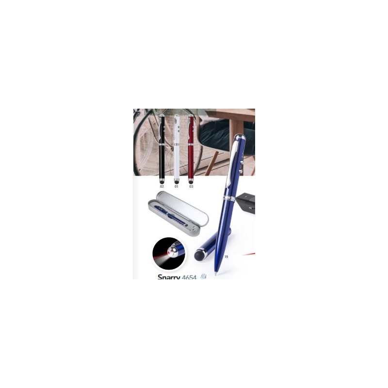 aser ball pen with hood, twist mechanism and in an elegant glossy metallic finish. With side activation buttons, practical fixing clip, hood with tactile pointer and curved body, specially designed for laser printing. Button cell batteries included, and presented in a stylish metal case with soft die-cut foam inside and spare batteries.