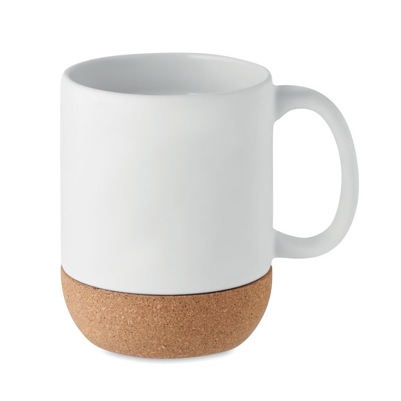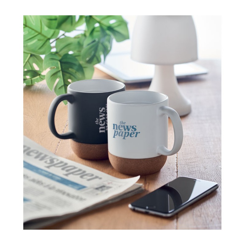 Matt ceramic mug with cork base detail. Capacity: 300 ml. Cork is 100% natural material. Due to its structural nature and surface porosity the final print result per item may have deviations.