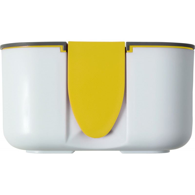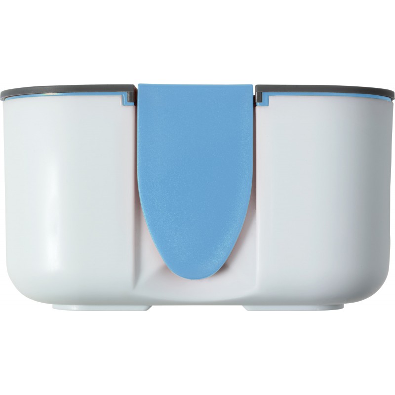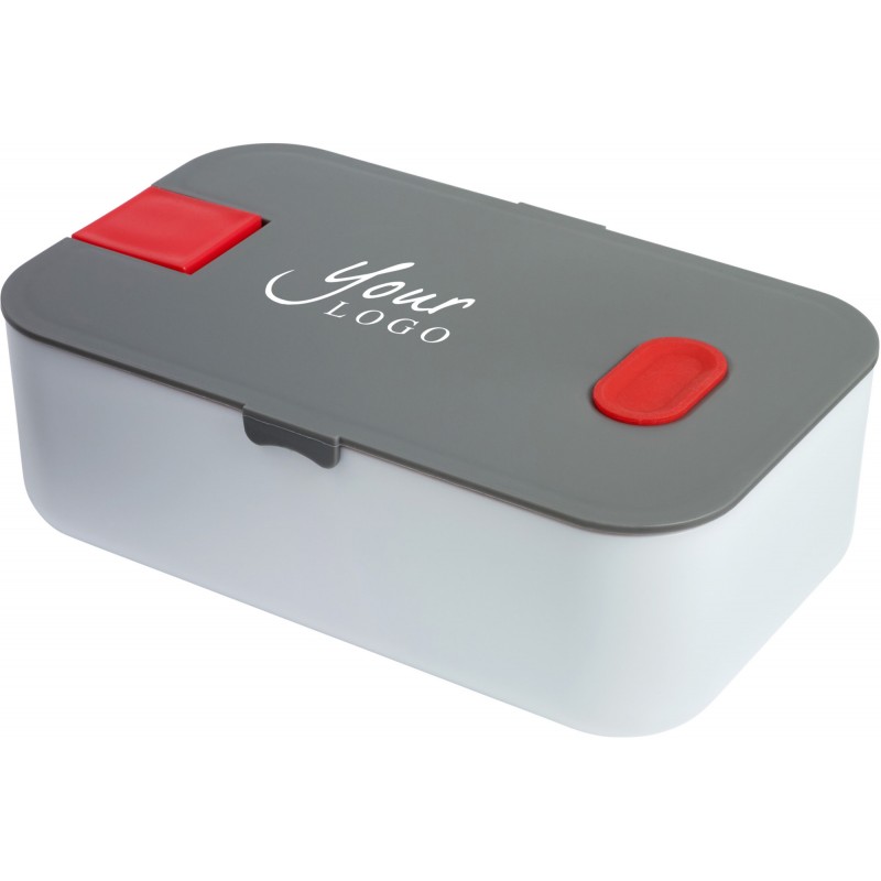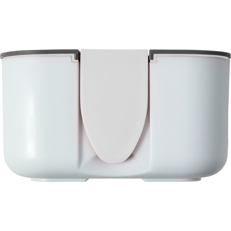 PP and silicone lunchbox with a capacity of 850 ml. The inside includes one separator. The closure on the lid doubles as a phone holder.