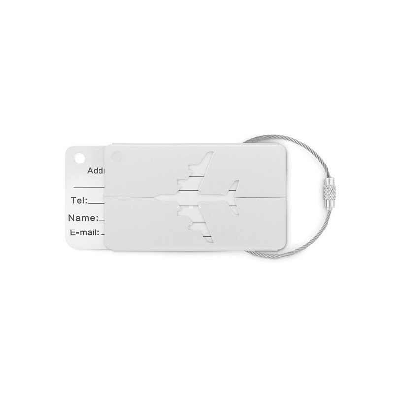 Aluminium airplane luggage tag with name and address label. Comes with metal string and screw connector.