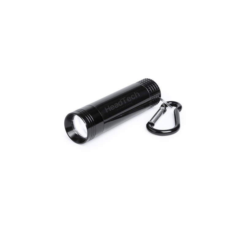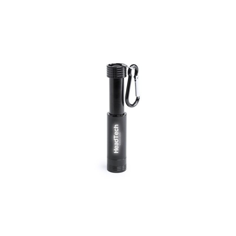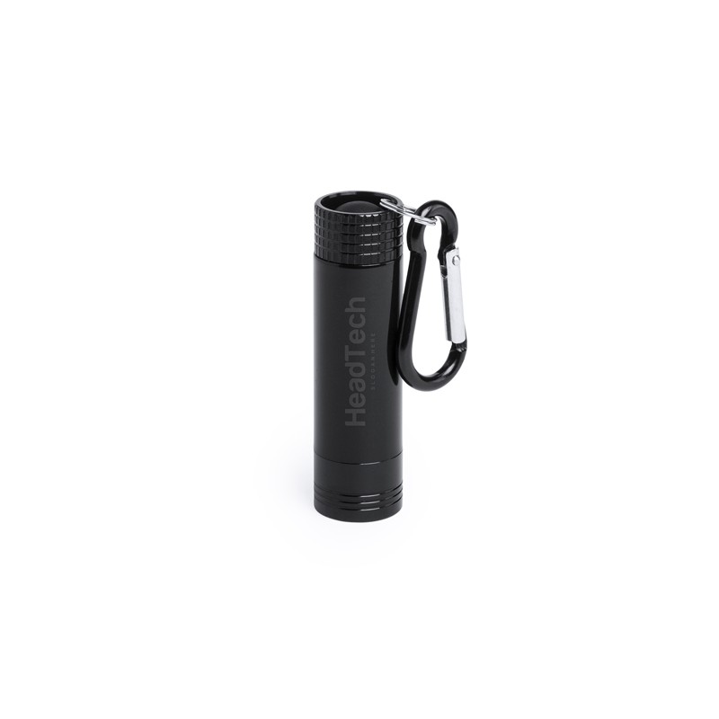 Extendable body torch in black metallic finishing. With inside LED light and body especially designed for laser printing, illuminating the logo. Carrying metal carabiner in matching color and battery powered -button cells included-.