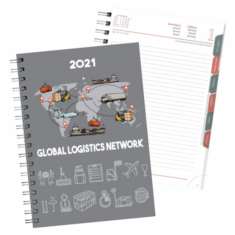 Ημερήσιο ημερολόγιο σε σπιράλ με ευρετηρίαση με χαρτόδετη εκτύπωση κάλυμμα . Εσωτερικό εκτυπωμένο με 2 χρώματα σε 4 γλώσσες (Ελληνικά, Αγγλικά, Γαλλικά και Γερμανικά) και περιλαμβάνει σε κάθε σελίδα μηνιαίο ημερολόγιο, αρίθμηση ημέρας και εβδομάδας, σελήνη καθώς και ώρες ανατολής και δύσης.