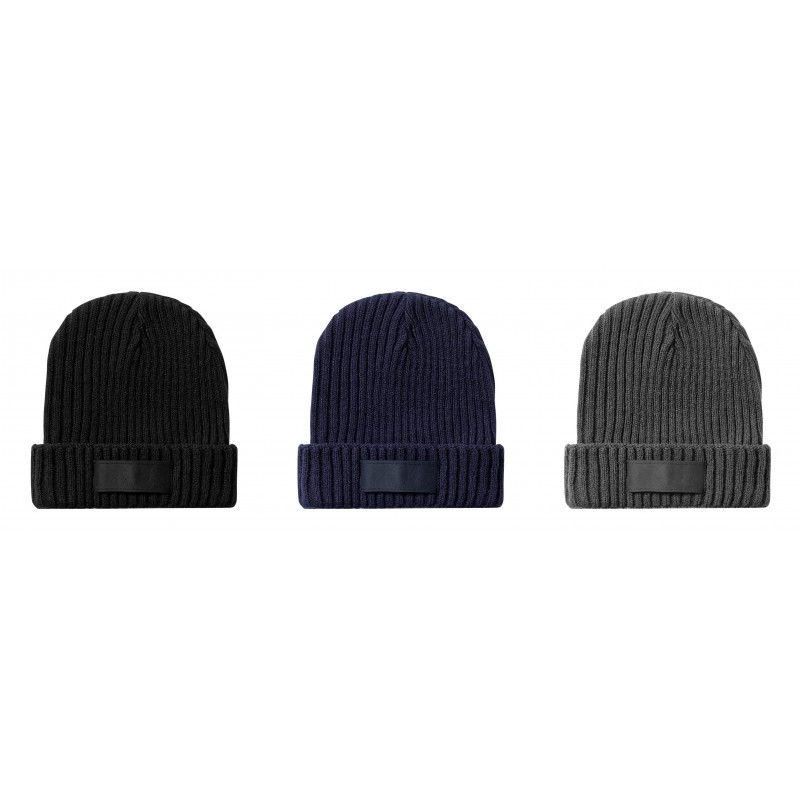 Soft and warm ribbed knitted hat, made in elastic acrylic material. Including matching label for branding, and available in a wide range of colors.
