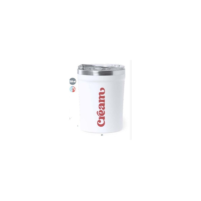 Table-top insulated cup made of stainless steel with a capacity of 350 ml. PP exterior, with dispenser and easy open lid. BPA free. Presented in individual kraft design box.