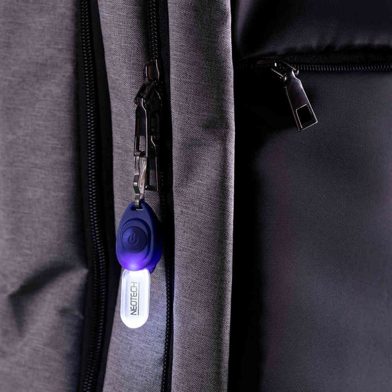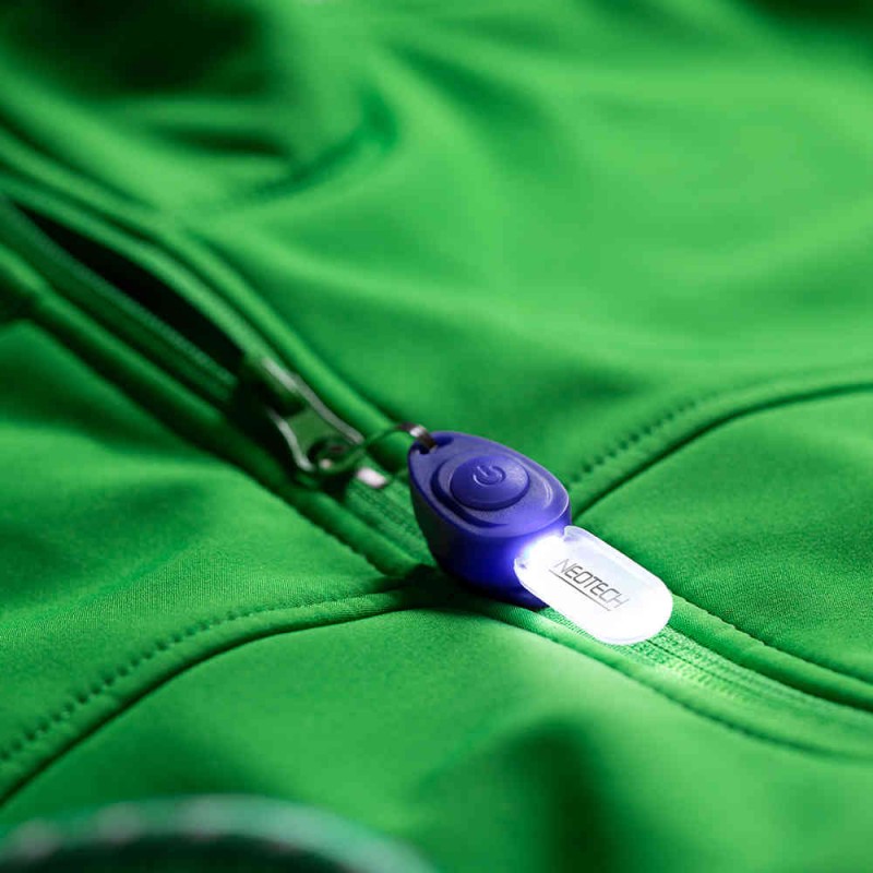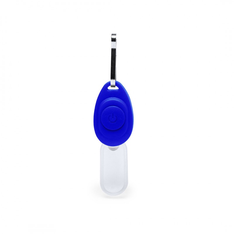 Security light in a sporty design, especially design for fitting in the zipper puller. White inside light with 2 lighting positions (direct and flashing) and ON/OFF button. Body in resistant ABS material, with lighting part in silicone and available in a wide range of colors. Battery powered (button cell included).