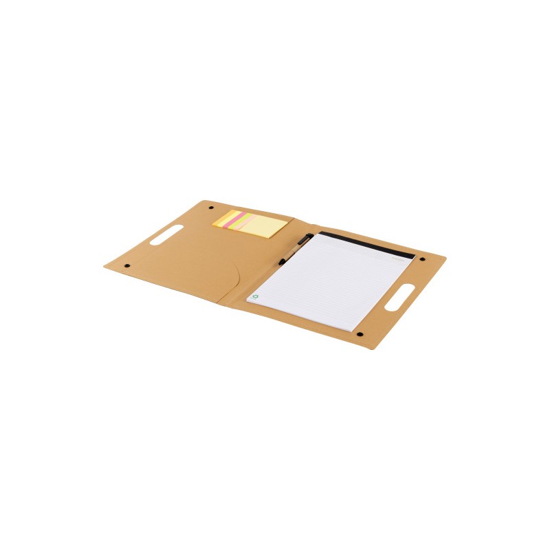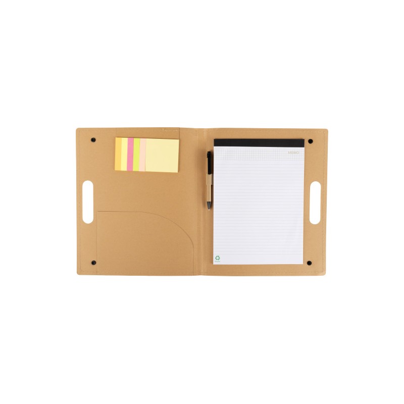 Cardboard writing folder with a 20 sheet notepad (approx. A4), a cardboard pen with black ink and adhesive memo notes in 4 colours, with 25 sheets per colour. The folder has an integrated handle.