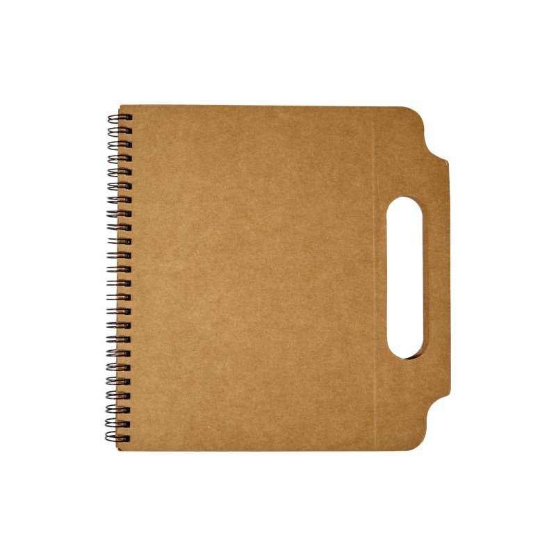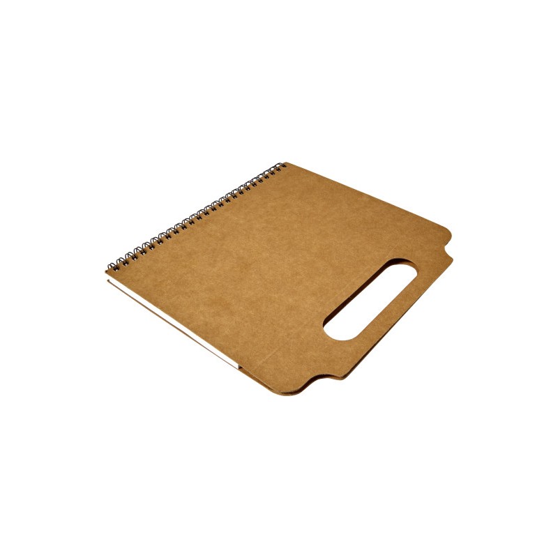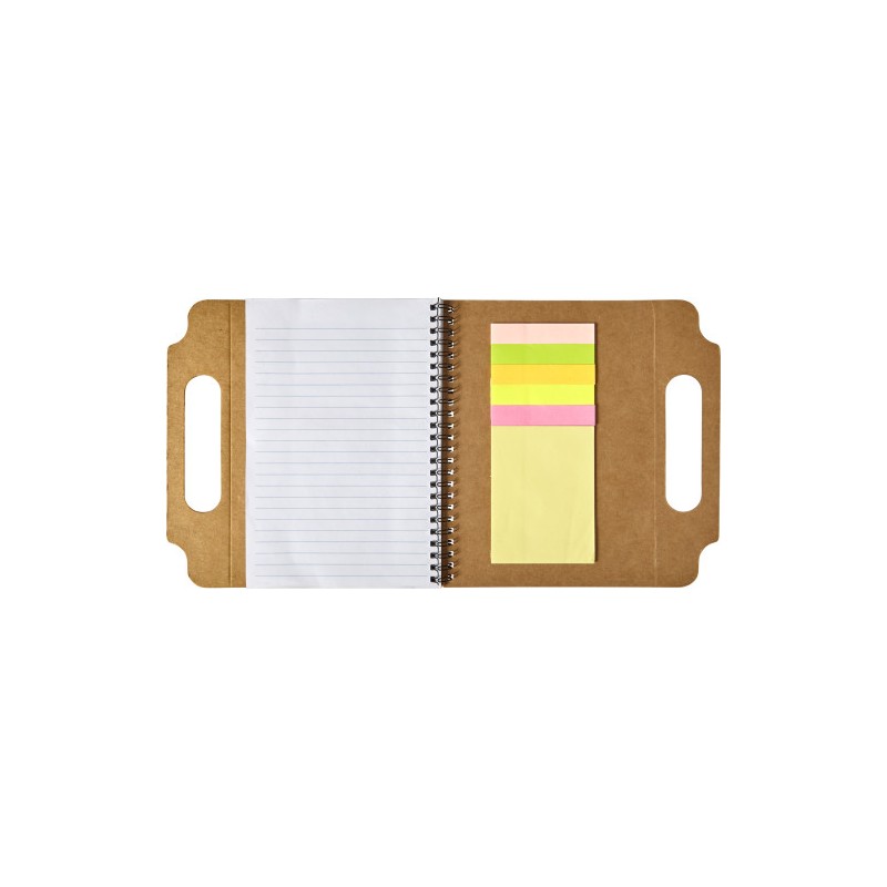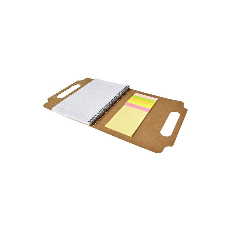 Cardboard notebook (A5) with handle and ring binder, a lined notebook (25 sheets) and various sticky notes inside. Pen not included.