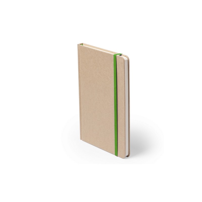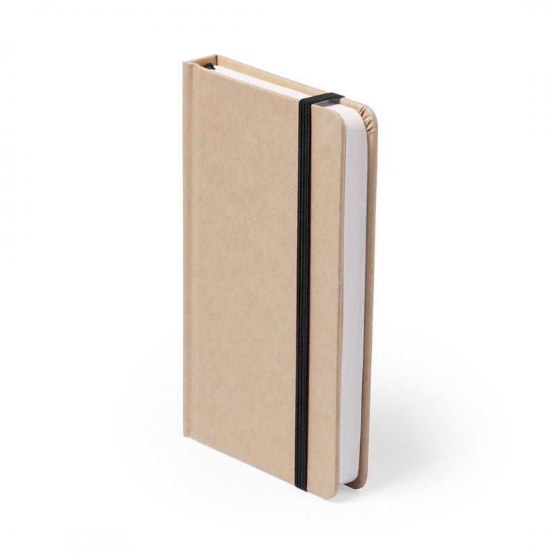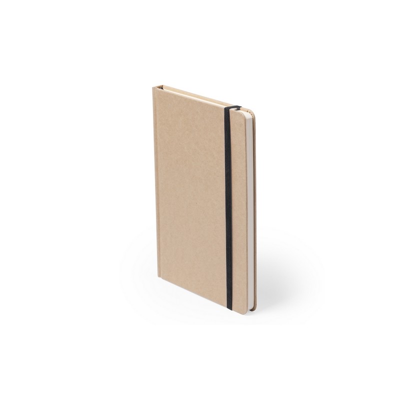 Notepad with soft touch covers in resistant natural cardboard. 100 blank sheets, with elastic band and matching color fabric bookmark.