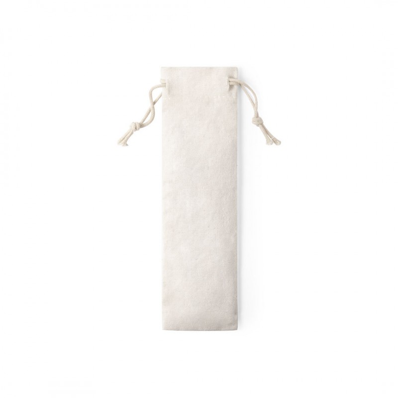 Set of cutlery in nature line. Made of bamboo, including fork, spoon and knife. Presented in a cotton pouch with self-closing strings.