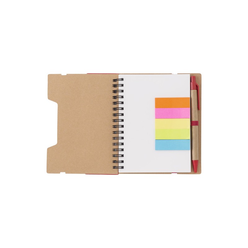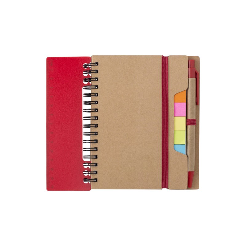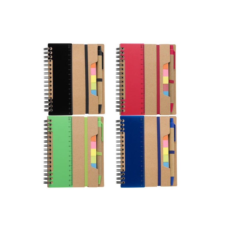 Recycled paper, wire bound notebook with 60 lined pages, ruler, and ballpen with blue ink. 5 Colours of sticky notes, 25 sheets per colour.