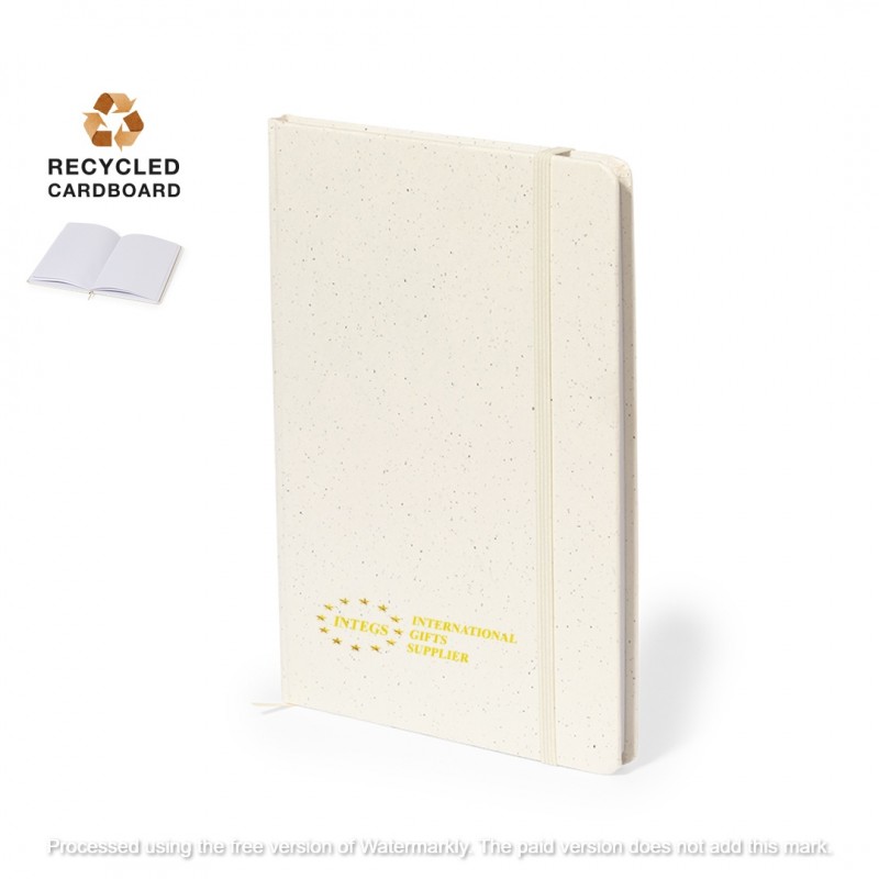 A5 notepad with hard cover in strong recycled cardboard. With 100 white sheets and elastic band for closing. Presented in an individual recycled bag.