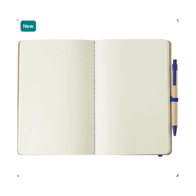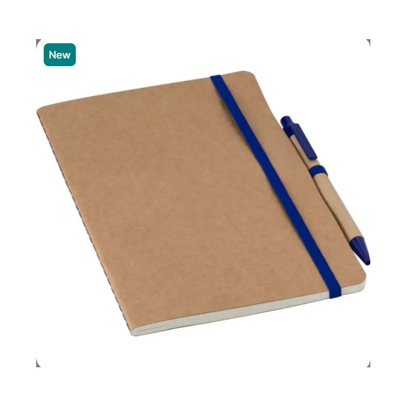 ecycled carton notebook (A5) with 120 blanc pages. With matching cardboard/wheat straw pen (blue ink) and elastic band and pen loop in same color.
