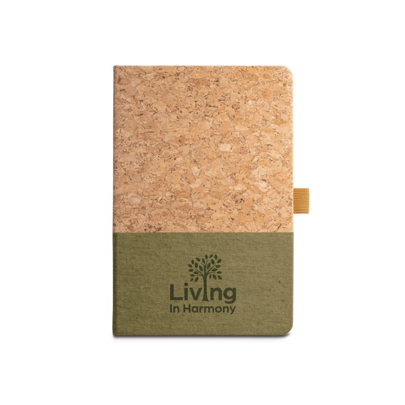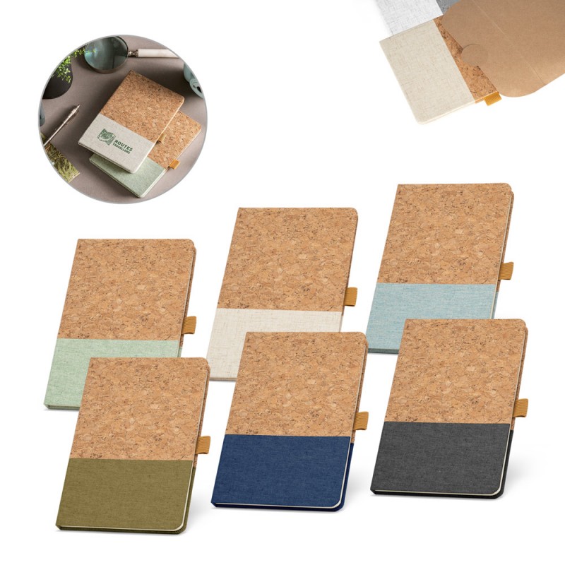 A5 notepad with cork cover and linen at the bottom of the cover. This notepad has 192 lined ivory pages from a sustainable forest management and pen holder (pen not included). Supplied separately with a kraft paper envelope with sticker. 140 x 210 mm