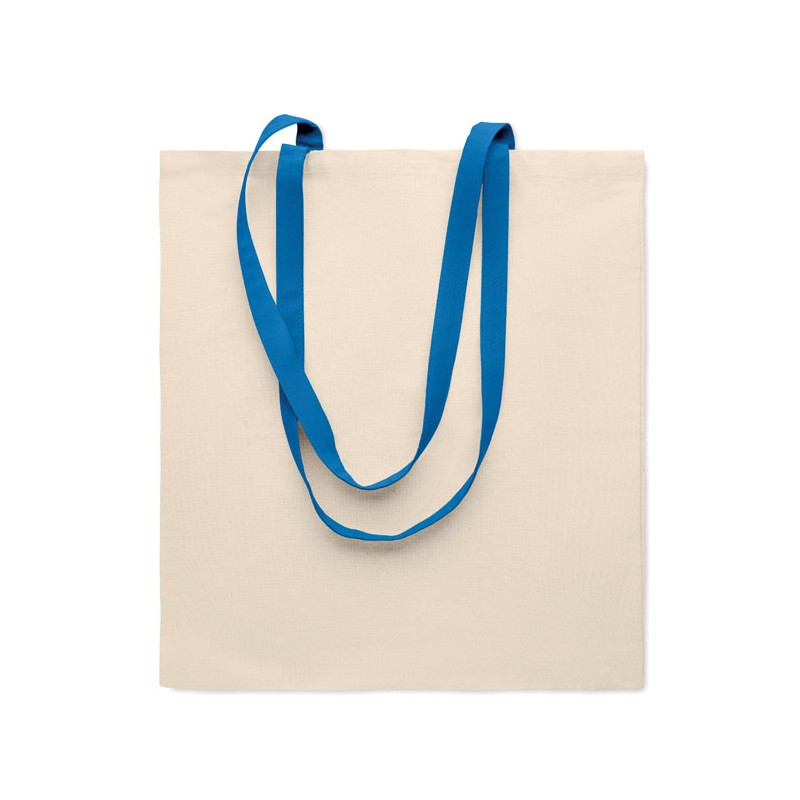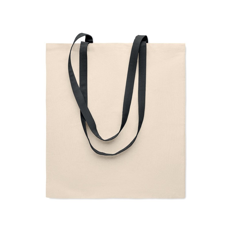 Shopping bag with long coloured handles made from cotton. 140 gr/m². This tote is perfect for daily groceries or other shopping activities. It's available with various coloured handles. Carry the bag over your shoulder when it's heavy and to keep your hands free. Carry weight limit: 2.5kgs. This product is OEKO-TEX® STANDARD 100 certified.
