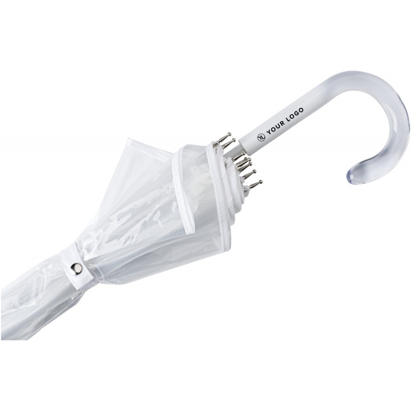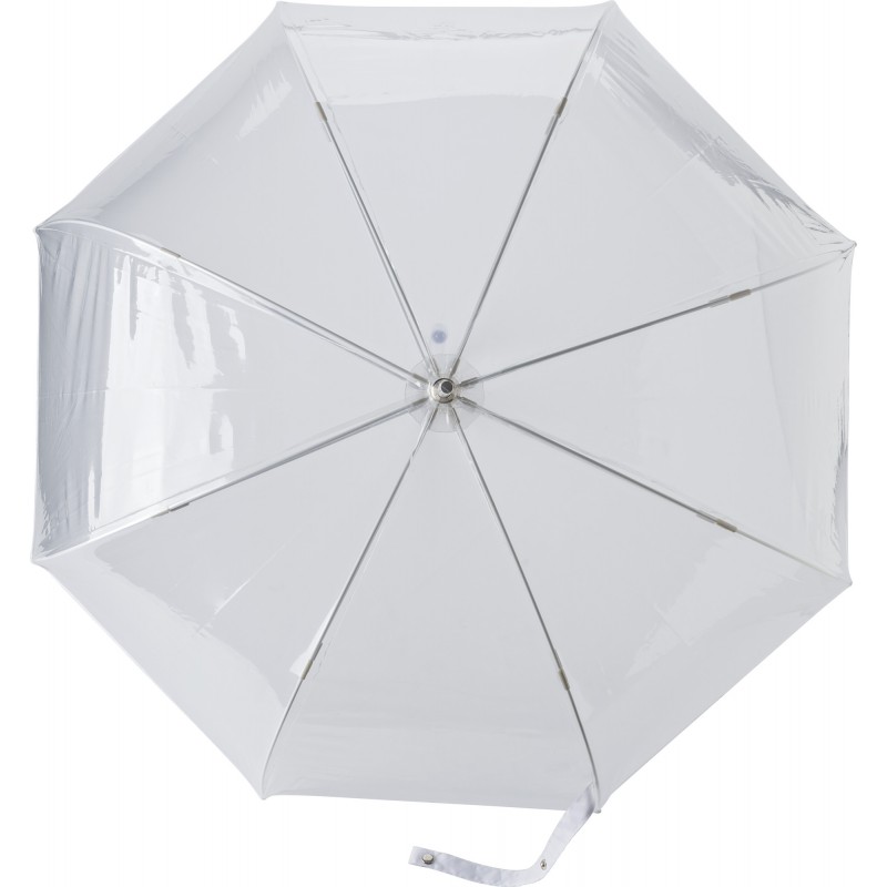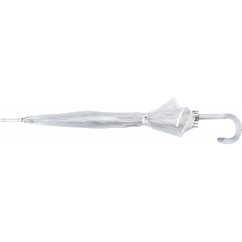 PVC umbrella with eight panels. Aluminium and fibreglass frame and plastic handle. Push button close.