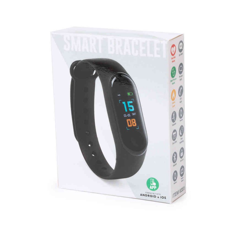 Multifunction smart bracelet in a sporty design, with Bluetooth® 4,0 connectivity and rechargeable via micro USB connector -integrated in the band-. Its TPU body and built-in 0,96 inches, color TFT display make of it the perfect gadget for all kinds of sports, leisure and everyday activities. With heart rate monitoring and several functions. APP available for iOS and Android. Presented in an attractive design box.