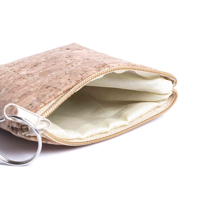 Ecologic, square design coin purse in natural cork and with a soft inner lining. Main compartment with matching color zipper opening and a carrying keychain.
