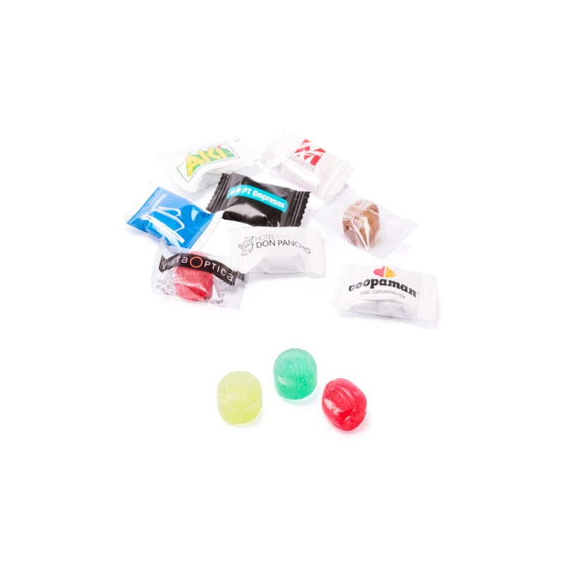 Candies of varied flavors in packaging 100% customizable. In assorted flavours: orange, lemon, strawberry, apple and cola.