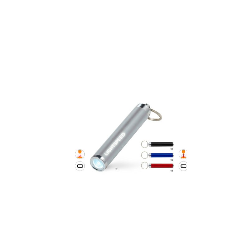 Pocket-sized LED flashlight with key ring. The glossy casing is especially designed for laser engraving; the imprint will be illuminated when the flashlight is switched on. Batteries included.