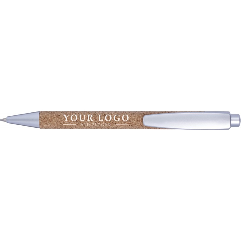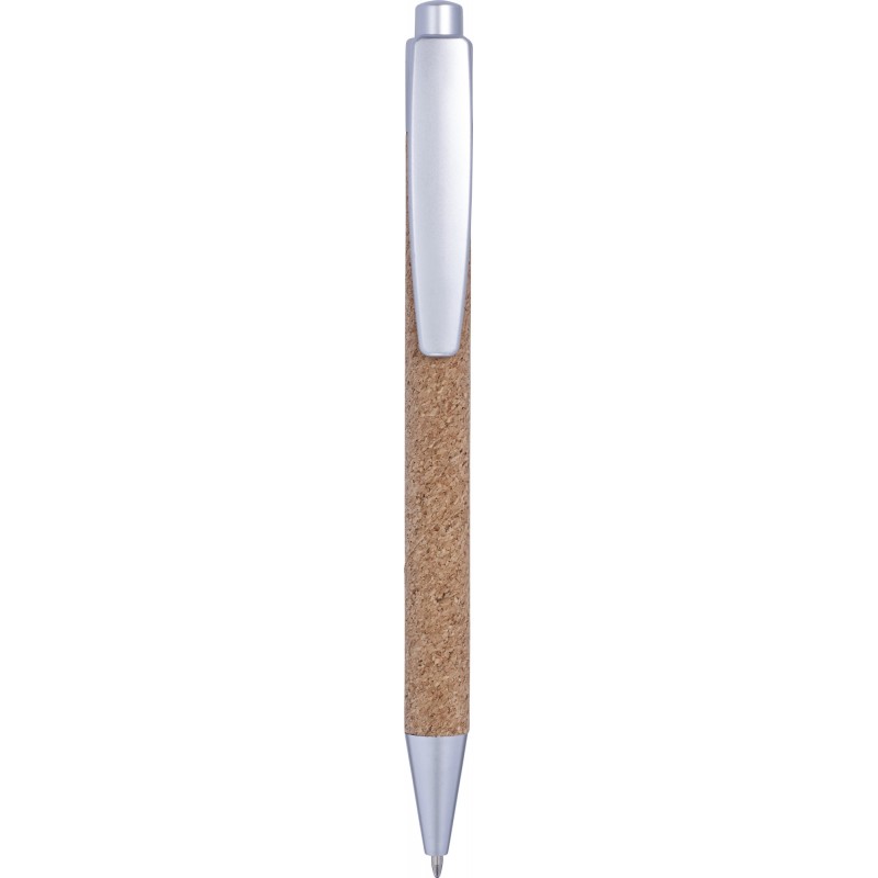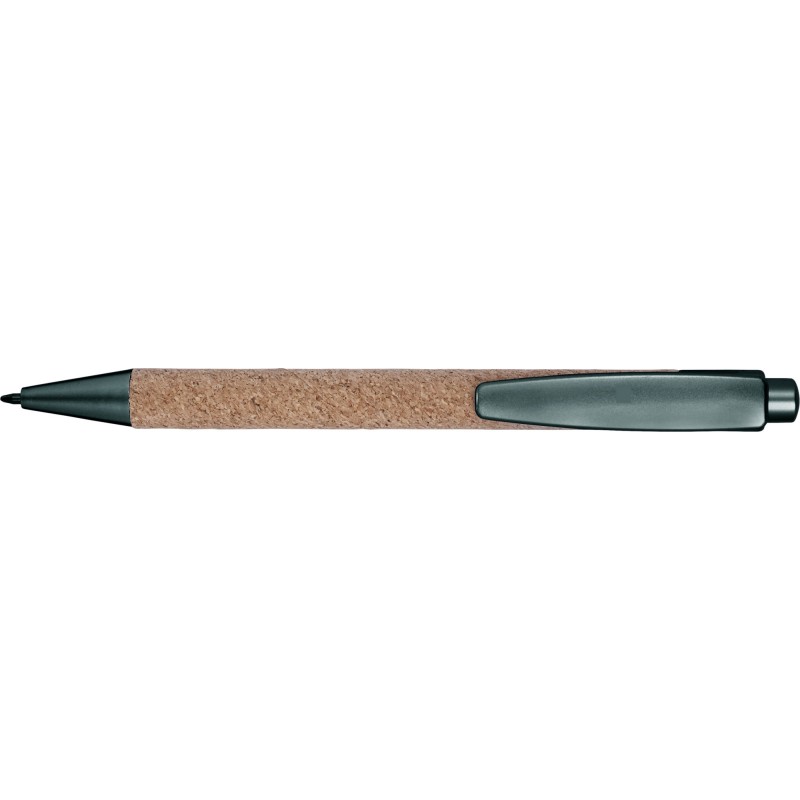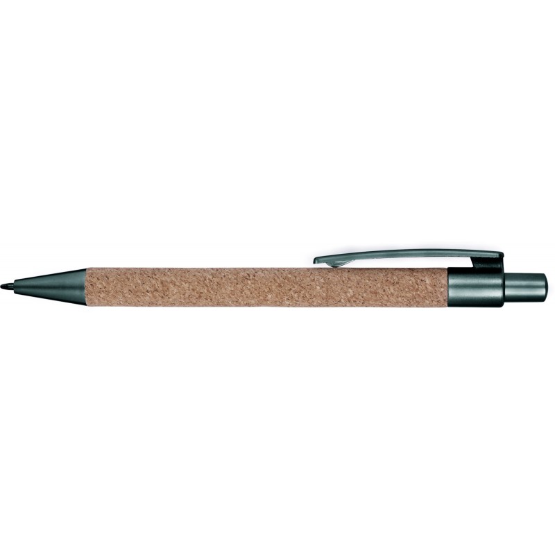 Ballpen with cork holder and plastic tip, clip and top with push button. Blue ink.