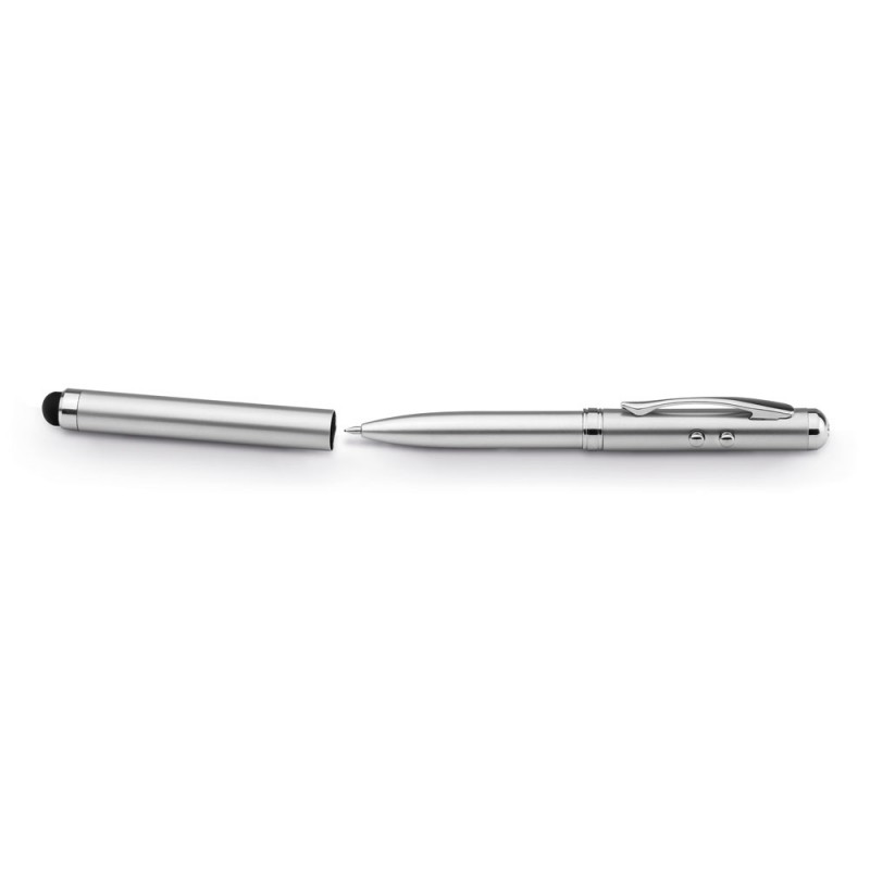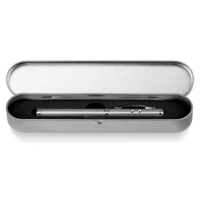 Multifunction metal ball pen with LED, laser pointer and touch tip. This ball pen is supplied in a metal case and includes 3 LR41 batteries. ø10 x 125 | Box: 178 x 38 x 19