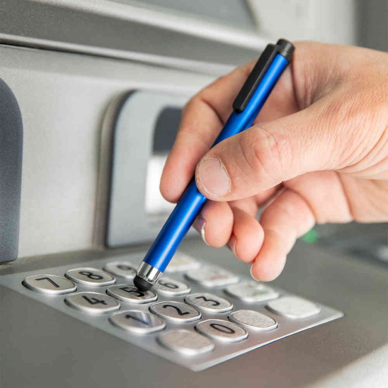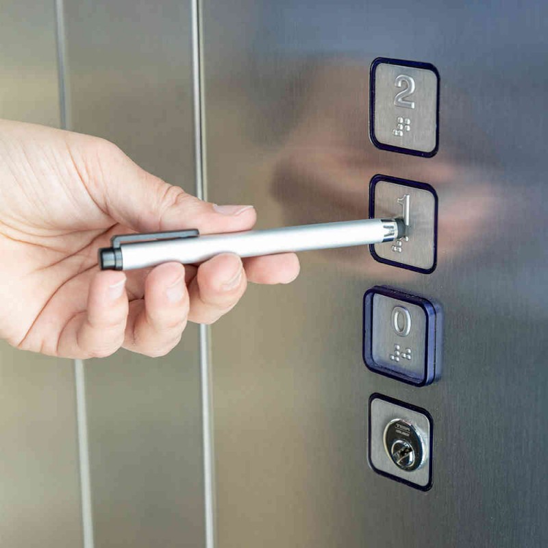 Tactile security pointer. Designed to encourage an hygienic and safe behavior in daily activities that require touching public surfaces (touch screens, ATM keyboards and payment terminals, lifts...). Easy to disinfect after each use, with a black color clip and available in a wide range of colors.