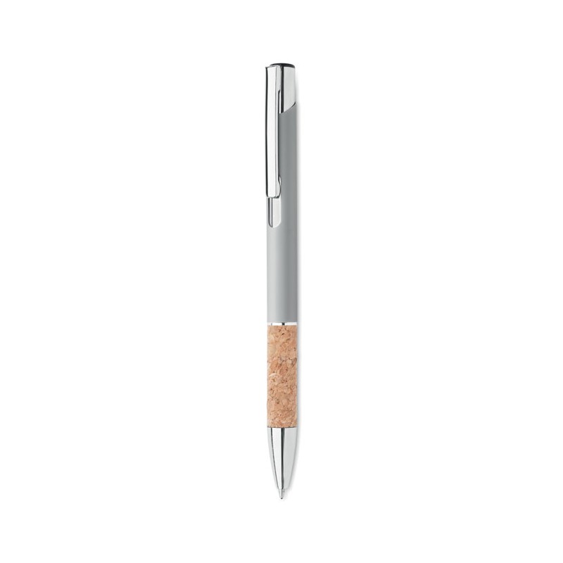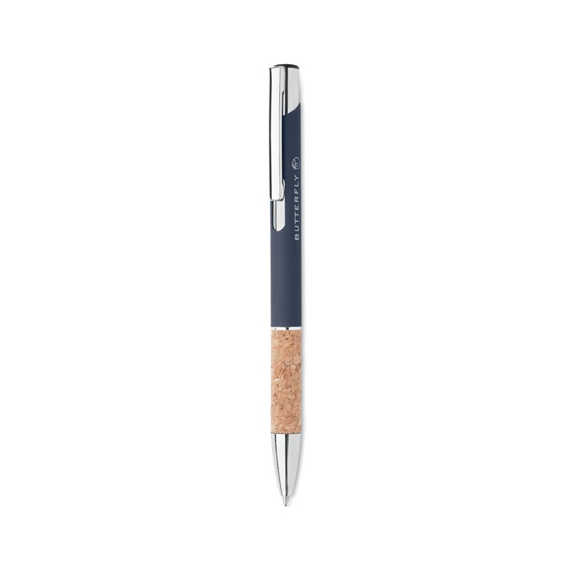 Push button pen in aluminium with cork grip. Blue ink.