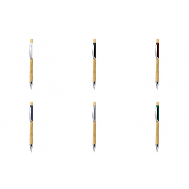 Stylish ball pen made of bamboo. Resistant Aluminium barrel with rubberised finish and bamboo grip, in a wide range of distinctive colours. Metal clip, with push-button mechanism and blue ink. Presented in an individual recycled bag.