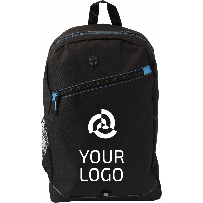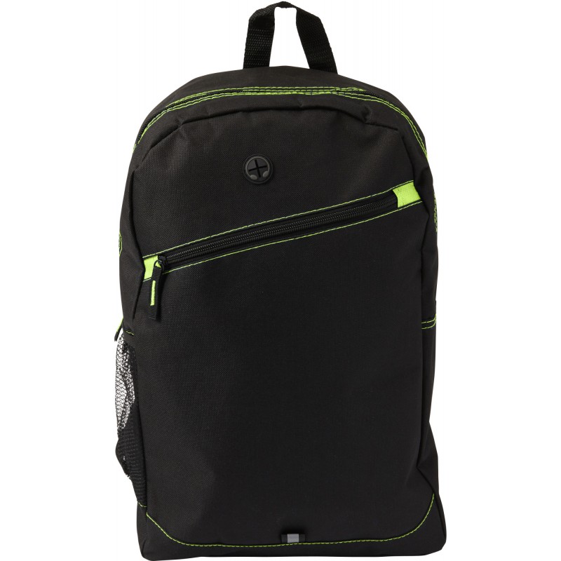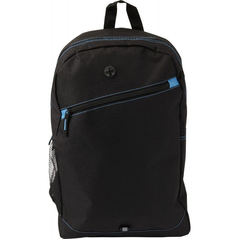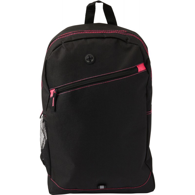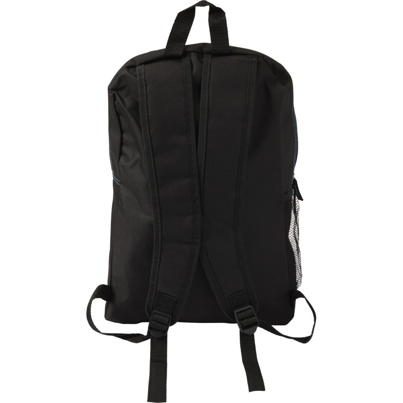 Polyester (600D) backpack with a zippered front compartment, mesh side compartment and opening for headphones. With padded adjustable shoulder straps.