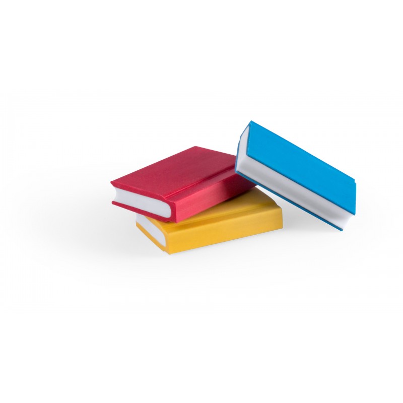 Fun set of 4 rubbers in the shape of a book in cheerful colors. Presented in a white cardboard display box.