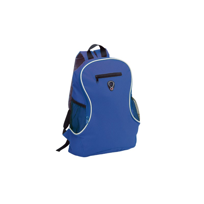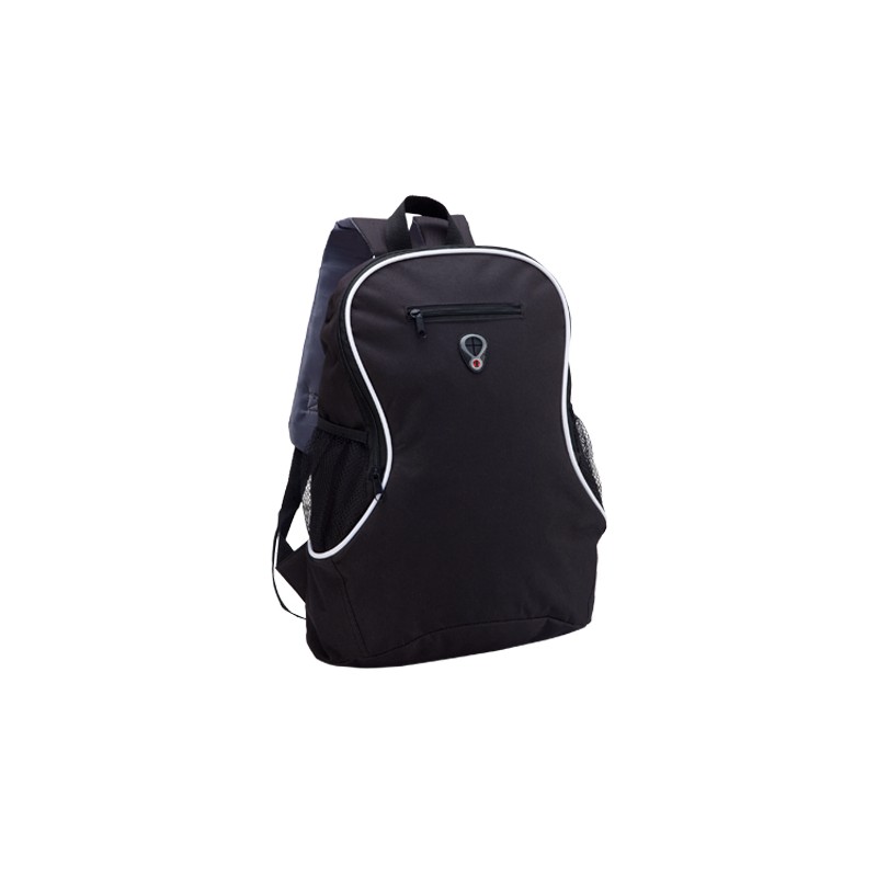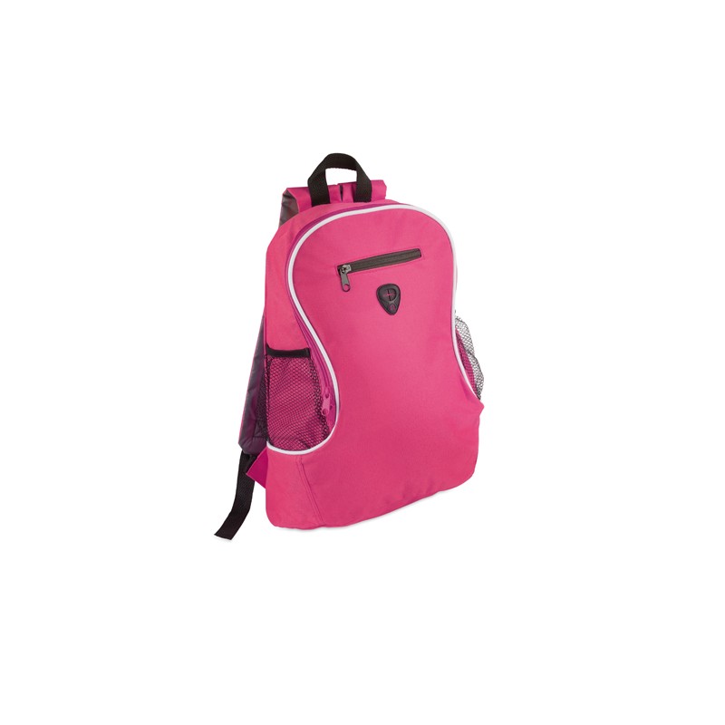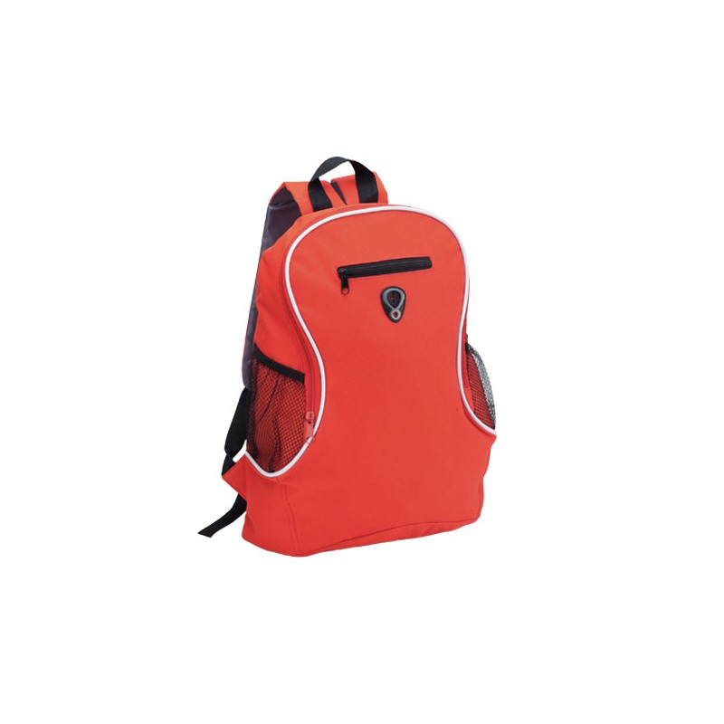 Resistant 600D polyester backpack in bold design, with zipper closure, headphones outlet, front pocket and elastic webbing pockets on the sides. Accessories in black, with adjustable shoulder straps with padding.