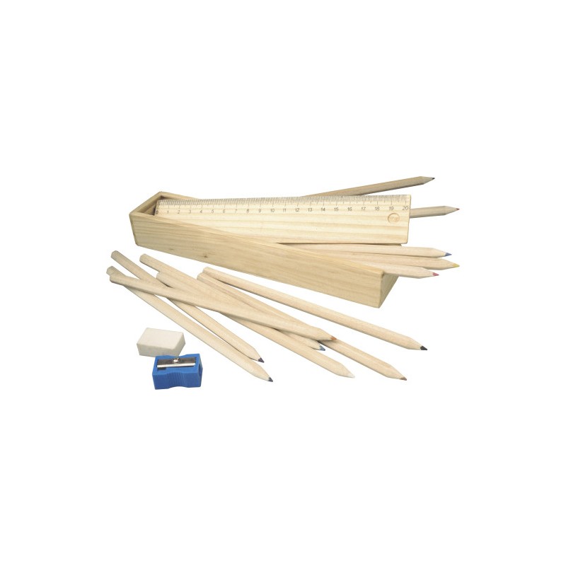 Σχολικό set,από 6 χρωματιστά μολύβια, ξύστρα, γομολάστιχα, χάρακα σε ξύλινη κασετίνα