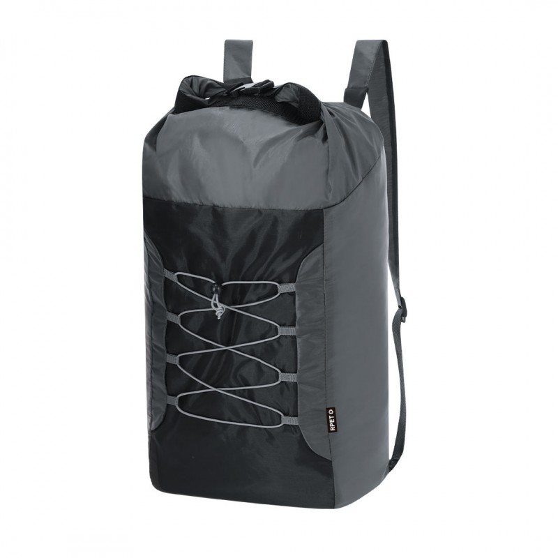 Foldable backpack made from durable RPET 210D and ripstop polyester. With loop closure on the main compartment, elastic cords, and adjustable shoulder straps.