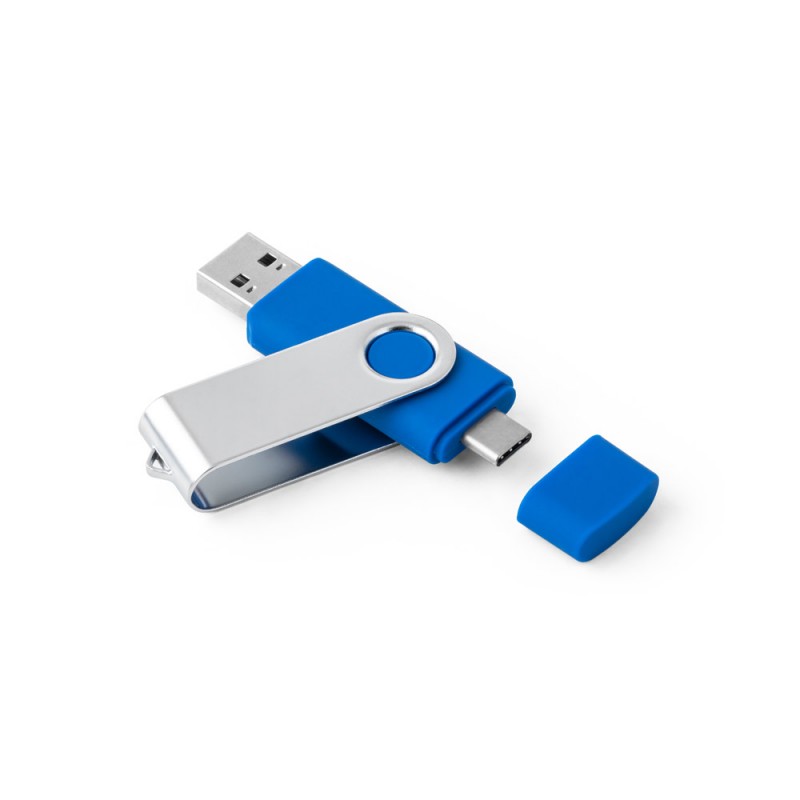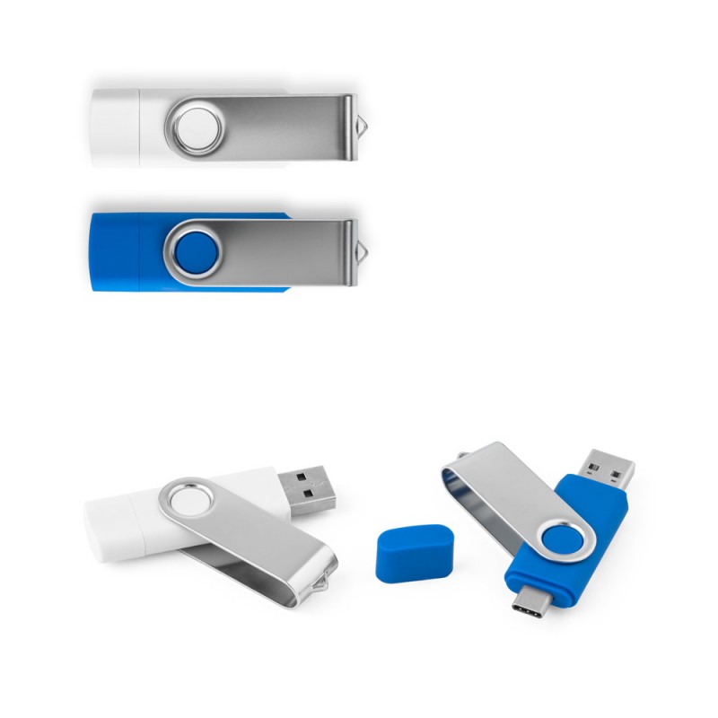 USB with capacity up to 128GB with rubber finish and metal clip. USB 2 in 1: USB-A and USB-C outputs. Customise this promotional gift with your logo. Packaging: This product includes a white paper gift box. Software Features: We provide the service of recording files and renaming the drive.67 x 19 x 10 mm