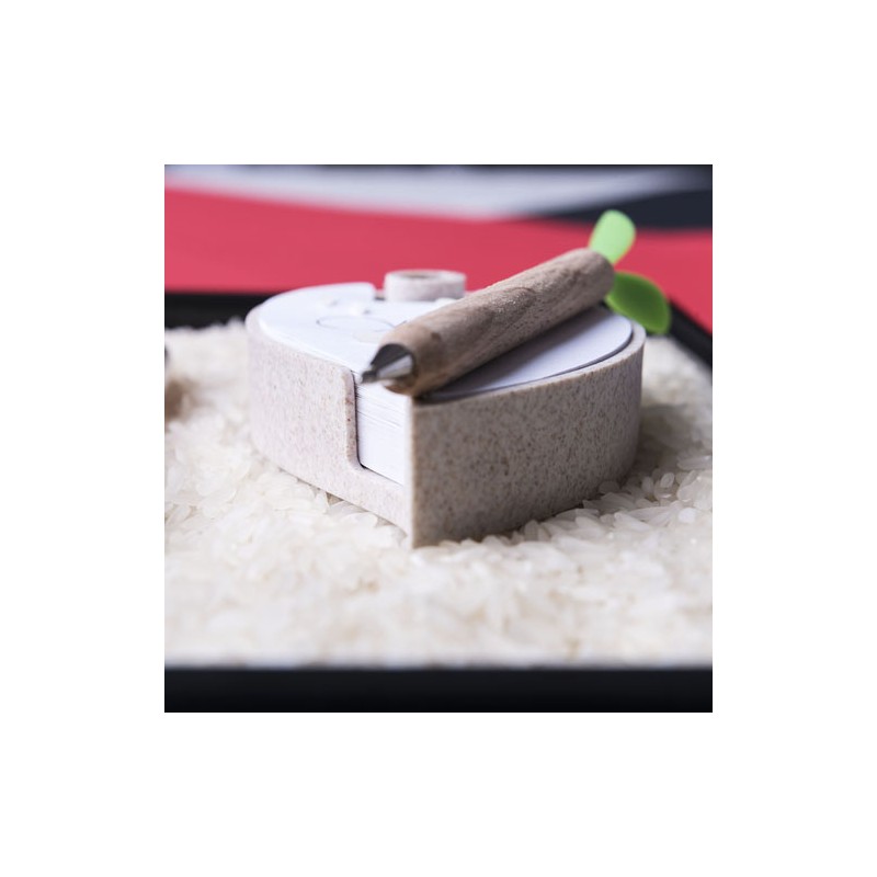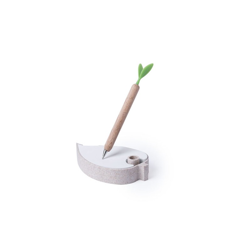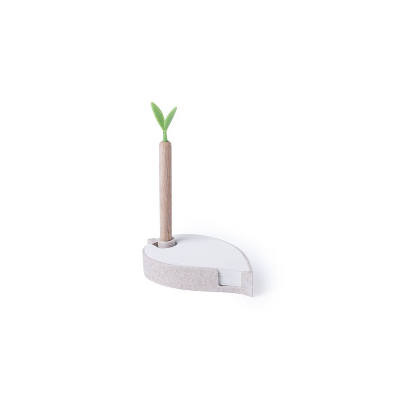 Nature line notepad holder with body made of recycled materials, in combination of wheat straw and PP. Including wooden eco ball pen with sheet detail on top -blue ink-. 125 notes leaf shaped. Presented in an individual, recycled cardboard case.